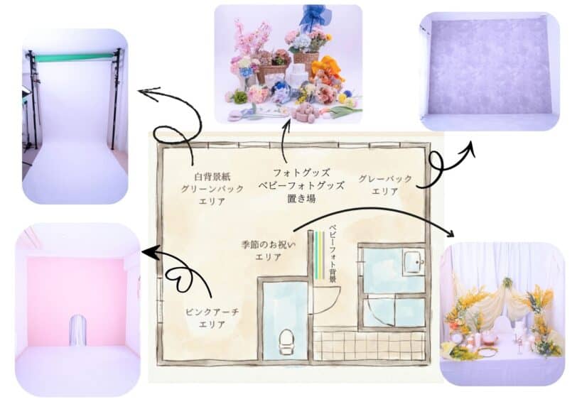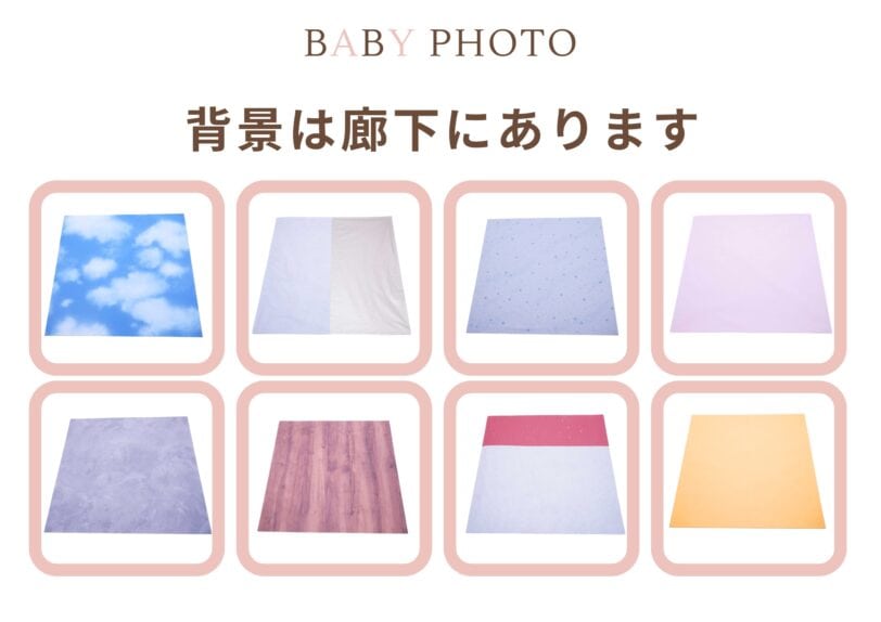 ベビーフォトはお好きなエリアにベビー用背景やサニーマットを配置して撮影していただけます。