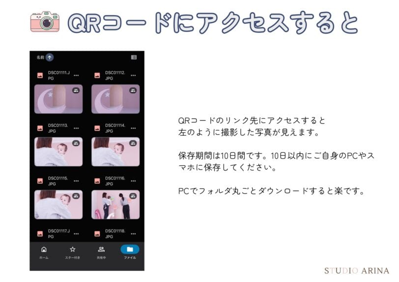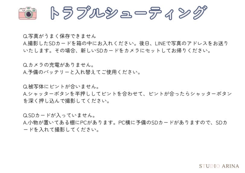 カメラをレンタルした際の写真の受け取り方です。スタジオにも印刷しておいてあります。