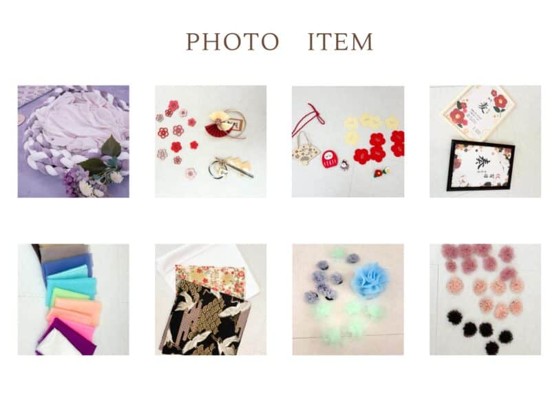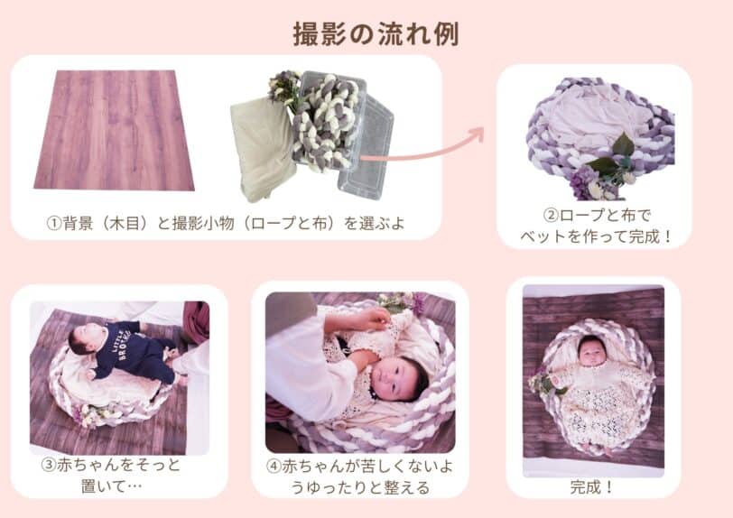 寝返り前のお子様の写真が撮影できるセットです。季節のブース以外のお好きな背景のエリアで撮影してください。